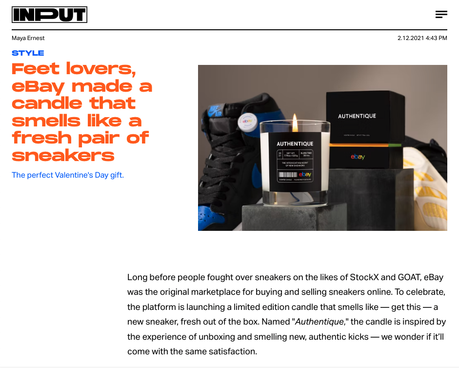 An unexpected yet essential step of the authentication process, sneaker experts at eBay’s authentication facility smell each pair before confirming they’re authentic. They can tell if something is off just from the scent. This is also a common behavior of sneakerheads when they cop a new pair. We worked with olfactory scientists to recreate the familiar smell and immortalize it in a limited edition candle that we dropped on Valentine’s Day. The candles sold out in minutes, reappearing for resale shortly thereafter on, you guessed it, eBay.